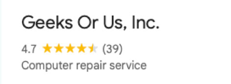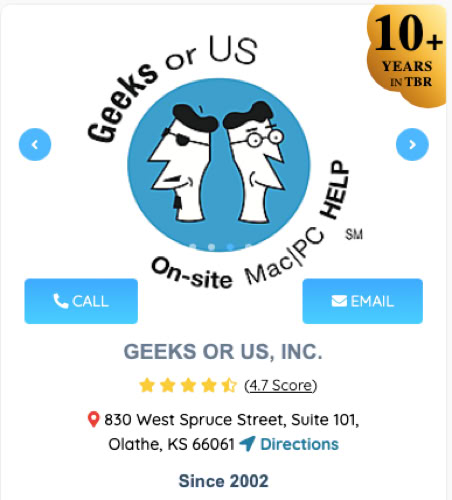 Threebestrated.com has awarded Geeks or US as the BEST computer repair company in Olathe, KS. In addition, a big box computer store considers Geeks or US as one of their preferred vendor referrals for on-site computer repair and services.